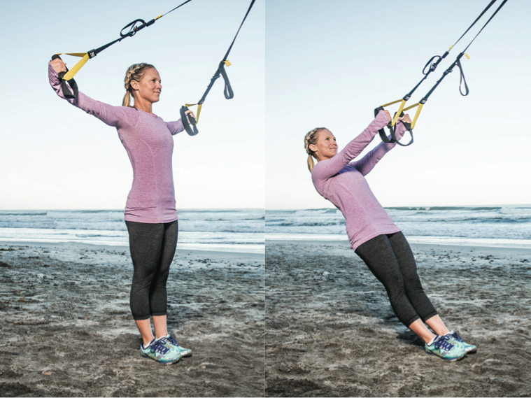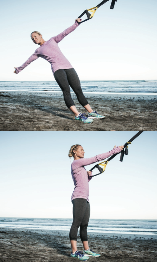 Как: встаньте боком к креплению ленты, возьмите сразу две ручки двумя руками, вытяните и закрепите руки перед собой и опускайте тело до угла 45 градусов в боковой плоскости. 8-10 повторений.